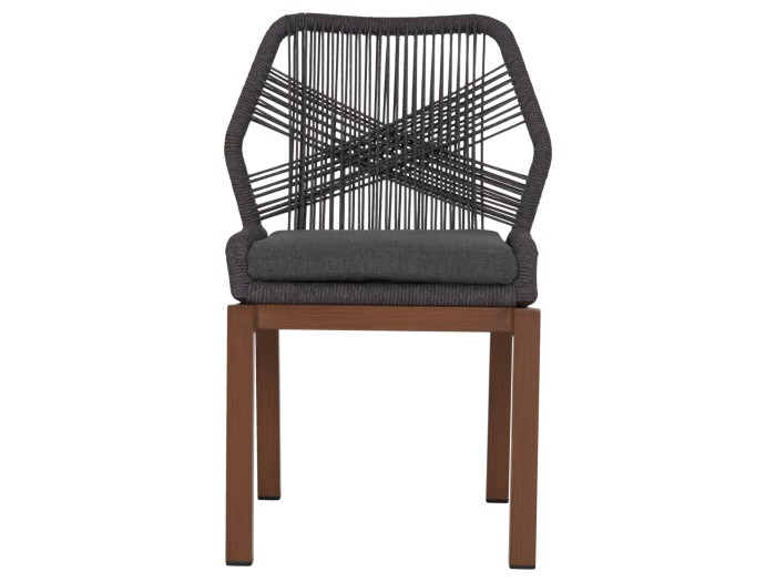 Η καρέκλα τραπεζαρίας εξωτερικού χώρου HOWARD δεν περνάει απαρατήρητη. Είναι κατασκευασμένη από αλουμίνιο και σχοινί. Τα πόδια είναι σε ΚΑΦΕ χρώμα ενώ το σχοινί και το μαξιλάρι καθίσματος είναι σε ΣΚΟΥΡΗ ΓΚΡΙ απόχρωση. Μια ποιοτική πρόταση τόσο για επαγγελματική χρήση, όσο και για οικιακή.