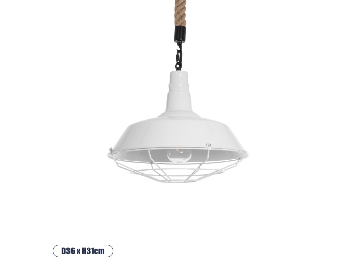 Vintage Industrial Κρεμαστό Φωτιστικό Οροφής Μονόφωτο Λευκό Γυαλιστερό Μεταλλικό Καμπάνα Πλέγμα με Μπεζ Σχοινί Φ36 GloboStar PUPPET 01412