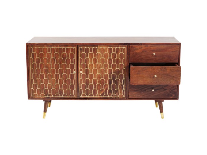 Χειροποίητη, compact συρταριέρα από μασίφ ξύλο μάνγκο με χρυσοποίκιλτα, σκαλιστά ανατολίτικα σχέδια, τρία συρτάρια και δύο ράφια
