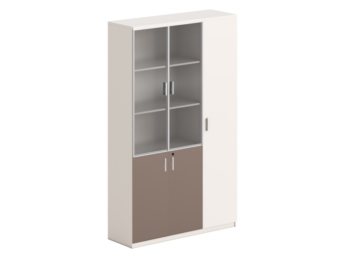 Στο επάνω μέρος διαθέτει γυάλινες πόρτες που κλείνουν δύο ράφια, ιδανικά για προβολή βιβλίων, φακέλων ή διακοσμητικών στοιχείων. Το κάτω μέρος φέρει πόρτες σε ανοιχτό καφέ χρώμα με κλειδαριά, οι οποίες κλείνουν ένα ράφι, προσφέροντας ασφάλεια για έγγραφα και προσωπικά αντικείμενα. Η δεξιά πλευρά, όπως την κοιτάς, αποτελείται από ένα στενό ντουλάπι με ράφια αυξάνοντας την χωρητικότητα του επίπλου.