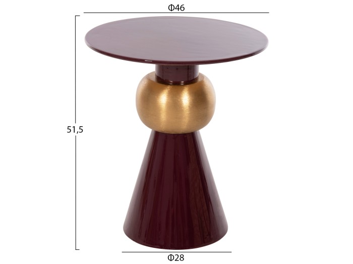 Το βοηθητικό τραπεζάκι PATNA για το σαλόνι είναι μια από τις νέες προσθήκες στην γκάμα μας. Πρόκειται για ένα μεταλλικό τραπεζάκι στρογγυλό με κωνική βάση και λαιμό που την συνδέει με την στρογγυλή επιφάνεια. Στον λαιμό υπάρχει «δαχτυλίδι» σε ΧΡΥΣΟ χρώμα που δίνει μια όμορφη διχρωμία αφού όλο το υπόλοιπο είναι σε χρώμα ΜΠΟΡΝΤΟ. Ιδανικό τόσο για το σπίτι, όσο και για επαγγελματικούς χώρους.