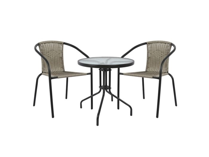Η πλάτη και το κάθισμα είναι ντυμένα με πλεκτό συνθετικό υλικό wicker σε ανοιχτό γκρι χρώμα.