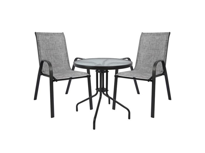 Δύο πολυθρόνες εξωτερικού χώρου από μεταλλικό σκελετό σε γκρι χρώμα με textilene 2x1 μεγάλης αντοχής σε ήλιο και βροχή.