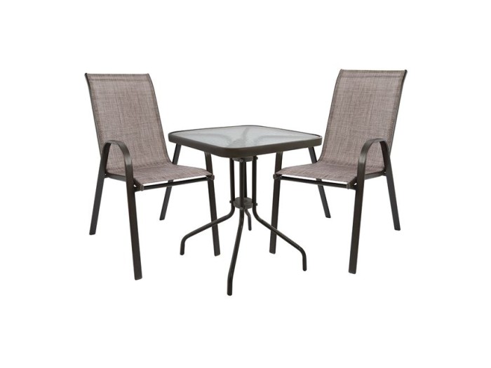Ένα τραπέζι μεταλλικό εξωτερικού χώρου σε χρώμα καφέ, με ενσωματωμένο τζαμί ασφάλειας (secure).