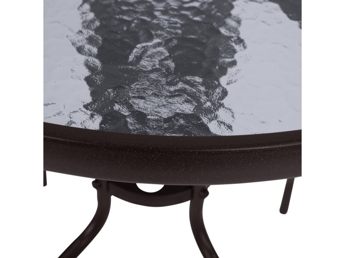 Ένα τραπέζι μεταλλικό εξωτερικού χώρου σε χρώμα καφέ, με ενσωματωμένο τζαμί ασφάλειας (secure).