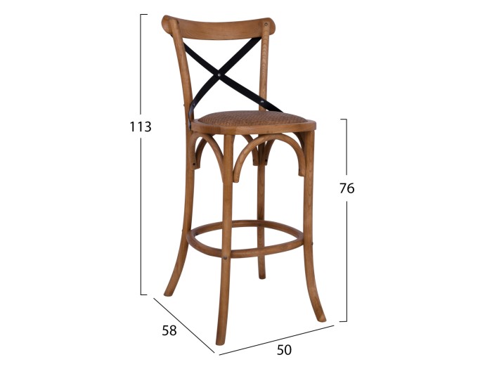 Σκαμπώ Bar ξύλινο υψηλής ποιότητας, με μεταλλικό χιαστί στη πλάτη σε μαύρο χρώμα και κάθισμα από ψάθα.