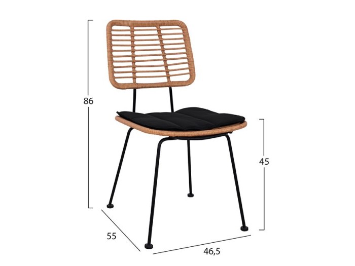 Τέσσερις καρέκλες κατασκευασμένες από μεταλλικό σκελετό σε μαύρη απόχρωση και επενδυμένες με πλεκτό wicker σε μπεζ απόχρωση.