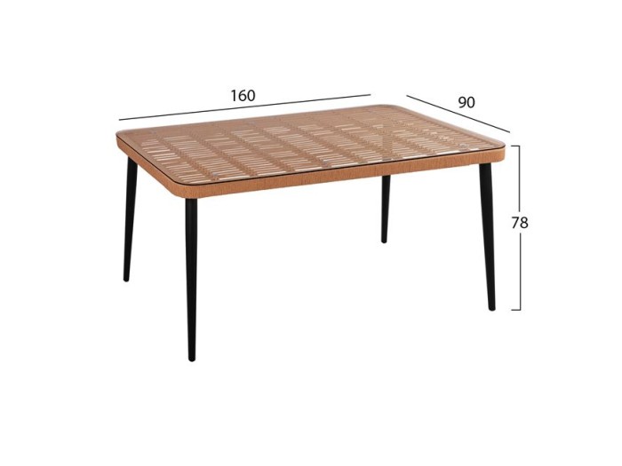 Ένα τραπέζι κατασκευασμένο από μεταλλικό σκελετό σε μαύρη απόχρωση και επιφάνεια επενδυμένη με πλεκτό wicker σε μπεζ απόχρωση.
