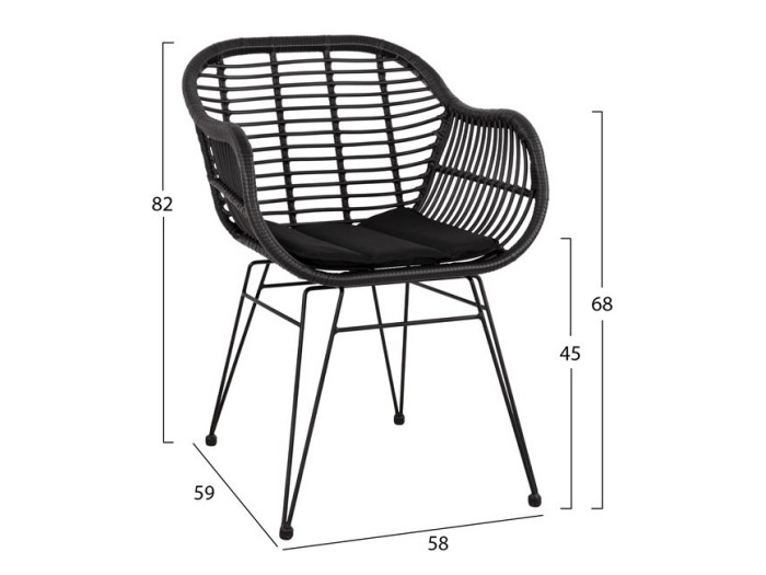 Τέσσερις καρέκλες κατασκευασμένες από μεταλλικό σκελετό σε μαύρη απόχρωση και επενδυμένες με πλεκτό wicker.
