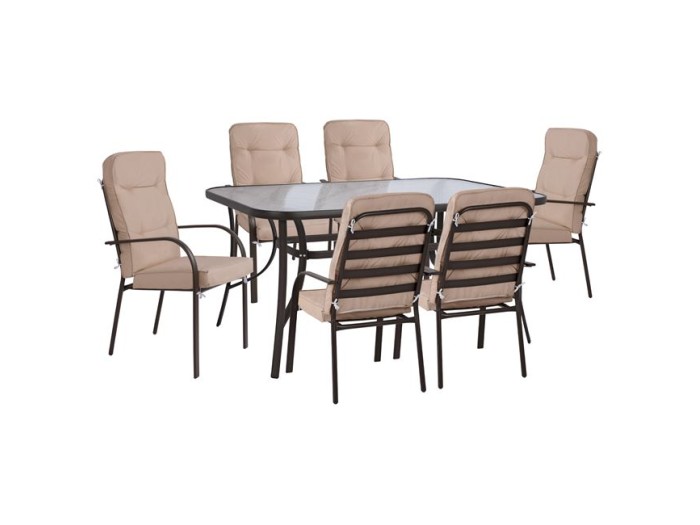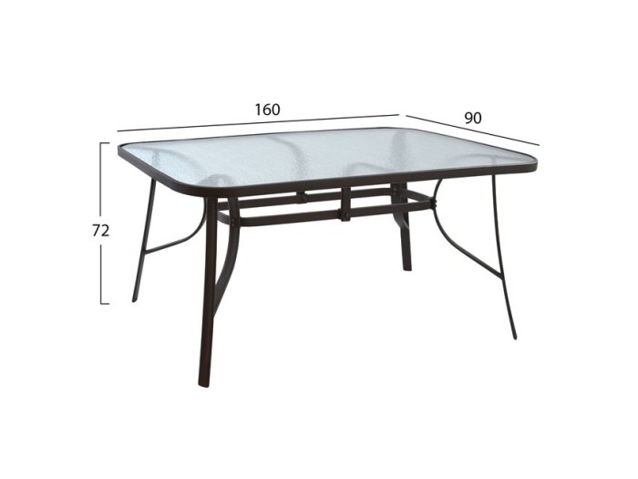 Ένα τραπέζι μεταλλικό εξωτερικού χώρου σε καφέ απόχρωση, με ενσωματωμένο τζάμι ασφαλείας (secure).