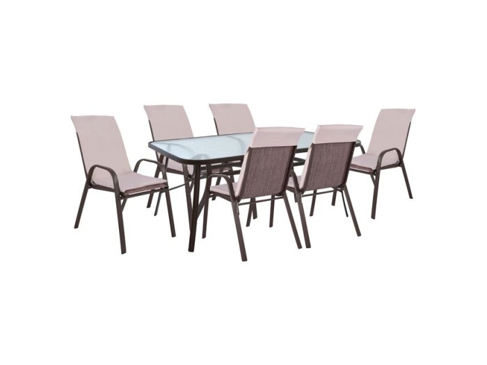 'Εξι πολυθρόνες εξωτερικού χώρου από μεταλλικό σκελετό σε καφέ χρώμα με textilene 2x1 μεγάλης αντοχής σε ήλιο και βροχή, με αδιάβροχο μαξιλάρι σε μπεζ απόχρωση.