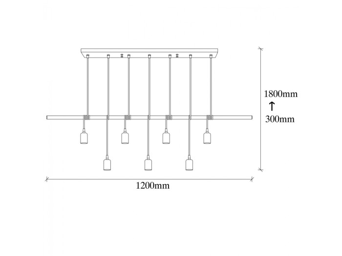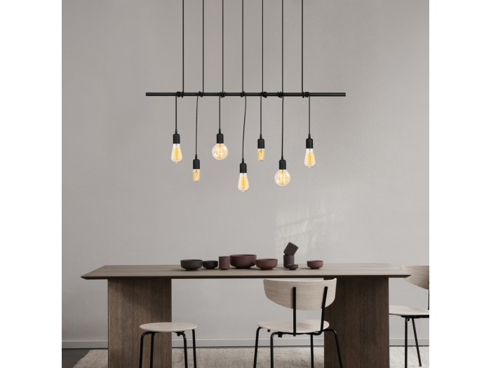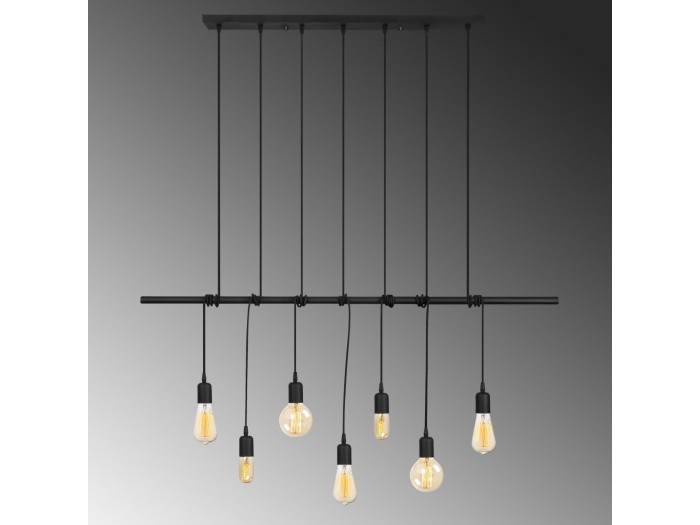 που σας επιτρέπει να ρυθμίσετε το ύψος που σας ικανοποιεί, σε μαύρη απόχρωση και 7 αναρτήσεις που καταλήγουν στους λαμπτήρες, επίσης μαύρου χρώματος.