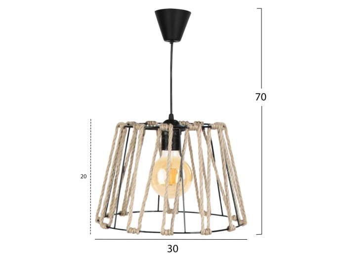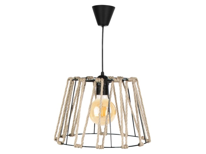 Πρόκειται για ένα μοντέρνο μονόφωτο με ρυθμιζόμενο ύψος για να ταιριάξει στα χαρακτηριστικά σας. Η διάχυση του φωτός γίνεται προς κάθε κατεύθυνση χάρη στον ανοιχτό σχεδιασμό του και αυτό το κάνει ιδανικό για πληθώρα χώρων, όπως σαλόνια, καθιστικά, κουζίνες εάν πρόκειται για το σπίτι σας και με εξαιρετική ευκολία μπορεί να ταιριάξει και σε επαγγελματικούς χώρους όπως εστιατόρια, καφέ, ξενοδοχεία κτλ. Το μαύρο χρώμα του φωτιστικού και το design με το δέσιμο του σχοινιού, αιχμαλωτίζει τα βλέμματα, αλλά ταυτόχρονα απαιτεί και ιδιαίτερη διακοσμητική συνοχή για να αναδείξει πλήρως τις αισθητικές αρετές του.