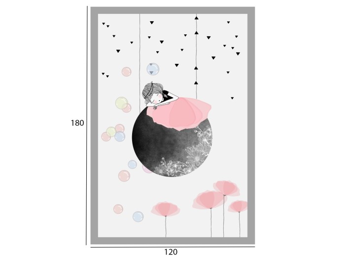 Αυτό το όμορφο χαλί έχει κυρίαρχα χρώματα το ΑΣΠΡΟ σε όλη την επιφάνεια του χαλιού, και μπορντούρα σε ΓΚΡΙ χρώμα. Το σχέδιο του χαλιού είναι μια όμορφη απεικόνιση μιας σφαίρας που παρομοιάζει το φεγγάρι, πάνω στο οποίο κοιμάται ένα κοριτσάκι. Σίγουρα, θα αναβαθμίσει το παιδικό δωμάτιο του σπιτιού και θα του δώσει ένα εντελώς καινούριο look!