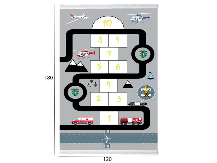 Αυτό το όμορφο χαλί (κυρίως για αγόρια) έχει κυρίαρχο χρώμα το γκρι σε όλη την επιφάνεια του χαλιού, και δεν διαθέτει μπορντούρα. Το σχέδιο του χαλιού, βέβαια, απεικονίζει με μια ποικιλία χρωμάτων το κλασσικό παιχνίδι «κουτσό» με διάφορα σχέδια και δρόμους τριγύρω. Άλλωστε, γιατί να μην είναι το ίδιο το χαλί… παιχνίδι;