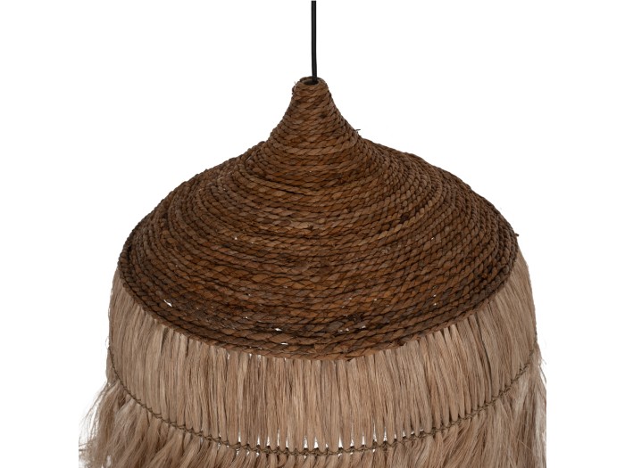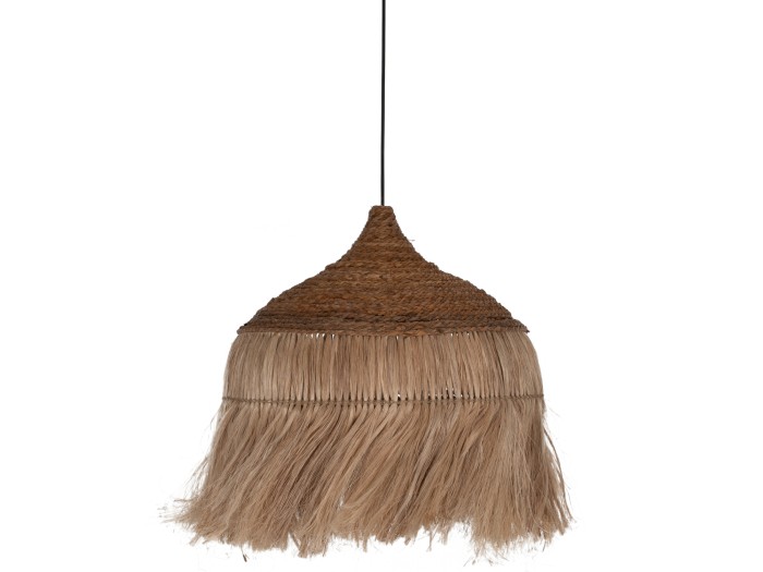 Hm7754- Kρεμαστό φωτιστικό---- Αν επιθυμείτε να διακοσμήσετε το χώρο σας με ένα φωτιστικό σε boho στυλ, αυτό είναι η πιο σωστή επιλογή. Είναι ένα μονόφωτο φωτιστικό για επαγγελματική χρήση, με «καπέλο» σε σχήμα καμπάνας φτιαγμένο από σκοινί, υψηλής ποιότητας και αντοχής στο χρόνο. Το ιδιαίτερο χαρακτηριστικό, όμως, αυτού του φωτιστικού είναι ότι το «καπέλο» στο μεγαλύτερο μέρος του αποτελείται από κρόσια, επιτείνοντας ακόμα περισσότερο το boho στυλ.