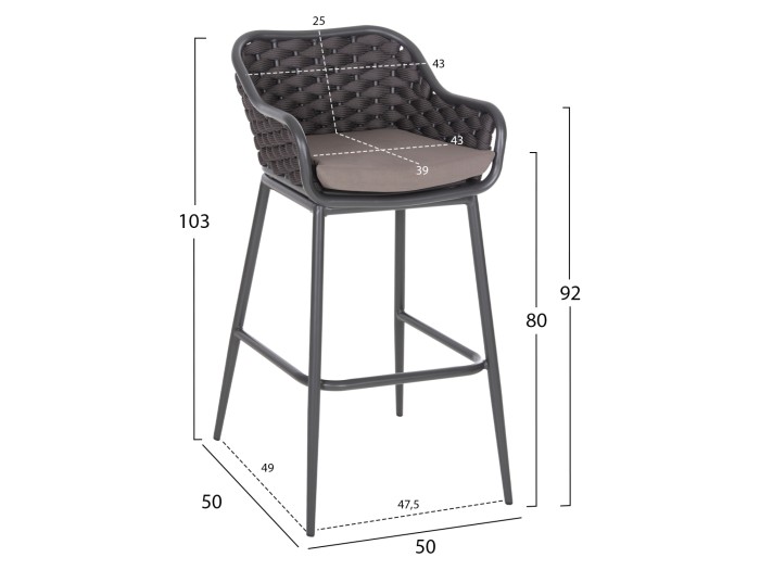 Το σκαμπό HM5862.01, κυρίως για επαγγελματική χρήση, είναι αυτό που ψάχνετε για ένα τέτοιο έπιπλο! Μοντέρνο, άνετο και σταθερό! Η διχρωμία του ΑΝΘΡΑΚΙ σκελετού με την ΚΑΦΕ επένδυση από σχοινί σε όλη την πλάτη είναι μοναδική. Η πλάτη με τα μπράτσα αποτελούν ένα ενιαίο κομμάτι με κάθετες βέργες που είναι πλεγμένες με σχοινί και αγκαλιάζουν το σώμα, ενώ η πλάτη είναι ψηλότερη από τα μπράτσα. Ο σκελετός είναι ψηλός και τα πόδια ενώνονται μεταξύ τους με μια δοκό που λειτουργεί ως υποπόδιο. Το μαξιλάρι του καθίσματος είναι σε ΓΚΡΙ χρώμα και είναι άνετο. Το σκαμπό αυτό θα αναβαθμίσει αισθητικά τον χώρο που θα το τοποθετήσετε και θα τραβήξει τα βλέμματα χάρη στα υλικά κατασκευής του.