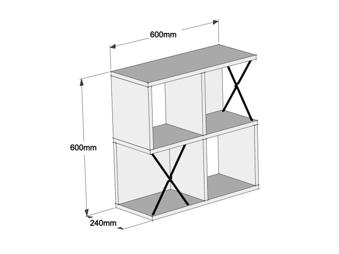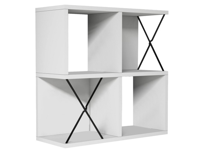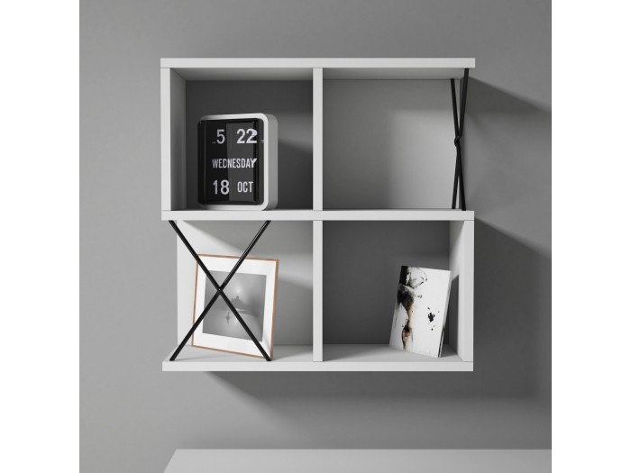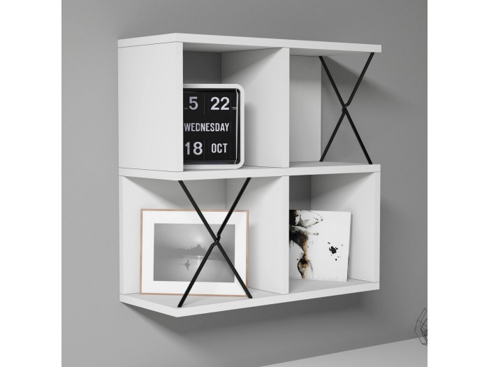 Το ράφι τοίχου μελαμίνης ΗΜ9520.03 σε ΛΕΥΚΟ χρώμα, συνδυάζει το απέριττο design με την πρακτικότητα. Αποτελείται από μια διάταξη 4 ραφιών σε μορφή κύβων, 2 εκ των οποίων έχουν και «πλάτη», με 2 μαύρα μεταλλικά Χ (βέργες) να σπάνε την κυριαρχία του λευκού δημιουργώντας όμορφη διχρωμία.