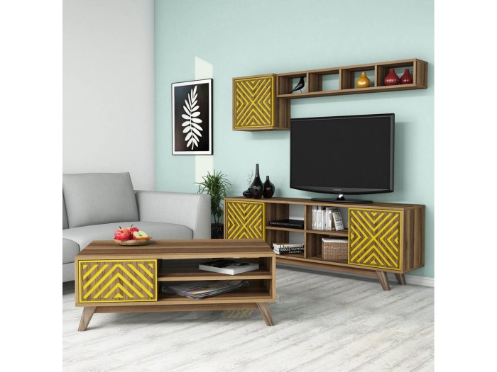 Η σύνθεση ΗΜ11853.04 θα αλλάξει την όψη στο σαλόνι σας και θα σας προσφέρει την αναβάθμιση που θέλετε. Αποτελείται από έναν συνδυασμό επίπλων για την τηλεόρασή σας με μονάδα δαπέδου, επιτοίχιο ράφι και επιτοίχιο ντουλάπι, και ένα τραπεζάκι σαλονιού. Χαρακτηριστικό όλης της σύνθεσης είναι οι πολλοί χώροι αποθήκευσης και τοποθέτησης αντικειμένων. Όλη η σύνθεση είναι της ίδιας σειράς και τα κυρίαρχα χρώματα είναι το ΚΑΡΥΔΙ και το ΚΙΤΡΙΝΟ.