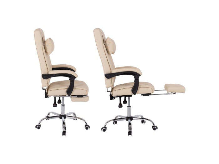 ΗΜ1057.12--Διευθυντική καρέκλα γραφείου σε ΜΠΕΖ χρώμα. Μια «πλούσια» και επιβλητική καρέκλα γραφείου με αναπαυτικά μπράτσα με εργονομική κλίση επενδυμένα με μαξιλαράκια. Η πλάτη είναι πολύ ψηλή ενώ έχει πλούσια στρώση από αφρώδη υλικά και έξτρα μαξιλαράκι στο επάνω μέρος της πλάτης για μεγαλύτερη άνεση κατά την χρήση. Υποστηρίζει ολόκληρο τον κορμό σας, ενώ είναι επενδυμένη με υψηλής ποιότητας PU δέρμα με καπιτονέ τεχνοτροπία, όπως επίσης και το φαρδύ και αναπαυτικό κάθισμα με την εξτρά αναπαυτική επιφάνεια. Η βάση είναι χρωμιωμένη σε σχήμα «αστέρι» με κυρτά πόδια και ασπρόμαυρα ροδάκια. Το χαρακτηριστικό, όμως, που κάνει αυτή την καρέκλα να ξεχωρίζει είναι ότι διαθέτει πτυσσόμενο υποπόδιο, το οποίο σε συνδυασμό με το γεγονός ότι η πλάτη «πέφτει» με μεγάλη κλίση, σας επιτρέπει να ξαπλώνετε και να ξεκουράζεστε όταν το επιθυμείτε!