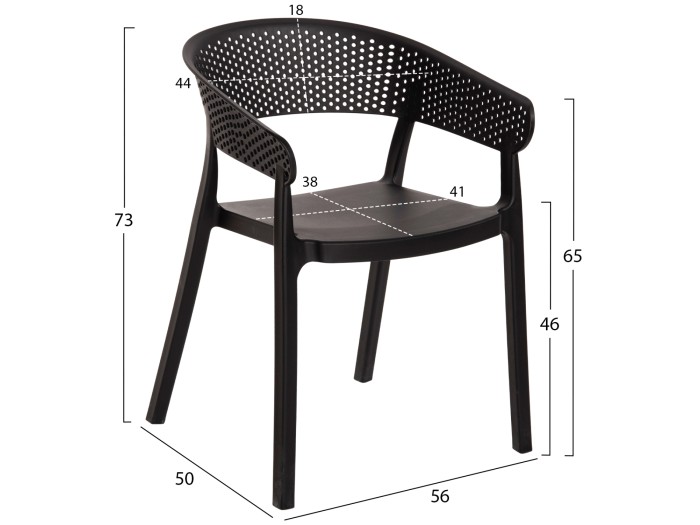 Πολυθρόνα πολυπροπυλενίου σε ΜΑΥΡΟ χρώμα. Ιδανική πρόταση για χρήση σε εξωτερικούς χώρους, είτε επαγγελματικούς (χώροι δεξιώσεων, εταιρείες catering, κλπ.) είτε για το σπίτι. Η πολυθρόνα αποτελείται από ένα λείο κάθισμα και μια ημικυκλική, ανεξάρτητη και «τρυπητή» πλάτη και μπράτσα. Είναι πανέμορφη και θα αναβαθμίσει αισθητικά κάθε εξωτερικό χώρο.