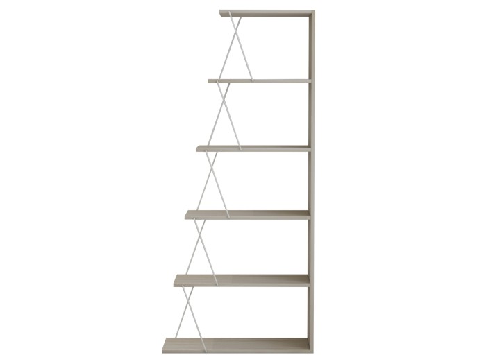 Διαθέτει 4 ράφια τοποθέτησης σε σχήμα σκάλας, τα οποία στηρίζονται μεταξύ τους με μεταλλικές ράβδους σύν ένα ράφι που είναι η κάτω επιφάνεια της βιβλιοθήκης, ενώ οι διαστάσεις της την καθιστούν βολική για πολλούς χώρους.