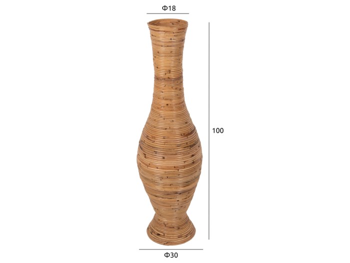 Το βάζο είναι κατασκευασμένο από εξαιρετικής ποιότητας RATTAN. Το Rattan είναι το καλύτερο και το πιο ευρέως χρησιμοποιούμενο φυσικό υλικό για διάφορες κατασκευές. Το Rattan που καλλιεργείται στην Ν.Α. Ασία είναι το ποιοτικότερο και ανθεκτικότερο υλικό από παρόμοια που καλλιεργούνται σε άλλες περιοχές. Με περισσότερα από 600 διαφορετικά είδη, το RATTAN μπορεί να διακριθεί ως ένα ισχυρό ινώδες φυτό που μοιάζει με το μπαμπού και χρησιμοποιείται για ευρέως επειδή είναι ελαφρύ, ανθεκτικό, εύκαμπτο και ελκυστικό.