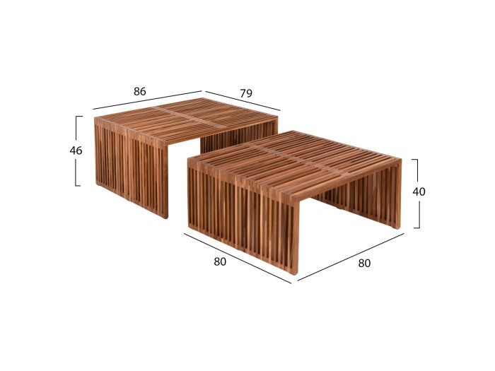 Το NYA είναι ένα σετ 2 τραπεζιών για το σαλόνι, με διαφορετικές διαστάσεις σε φυσικό χρώμα ξύλου. Τα τραπέζια είναι φτιαγμένα από ξύλα ΤΕΑΚ. Αυτό το σετ θα αναβαθμίσει αισθητικά το σαλόνι σας ενώ μπορεί να ταιριάξει με πολλά διαφορετικά στυλ και χρώματα στον τριγύρω χώρο. Οι υπάρχουσες ρωγμές ή αυτές που ενδέχεται να δημιουργηθούν με την πάροδο του χρόνου οφείλονται στην συστολή-διαστολή του ζωντανού οργανισμού που λέγεται μασίφ ξύλο, και δεν αποτελούν κατασκευαστικό ελάττωμα, δίνοντας πρωτοτυπία και μοναδικό design στο χώρο σας. Αυτά δεν αποτελούν ελάττωμα του προϊόντος.