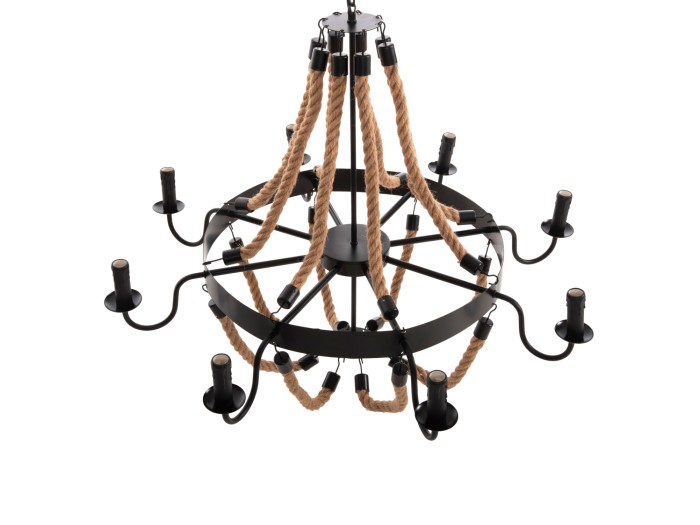 Το πολύφωτο ΗΜ4178 είναι μια ακόμα εντυπωσιακή προσθήκη στην γκάμα μας. Ο μαύρος μεταλλικός σκελετός του είναι κυκλικός και κρέμεται με αλυσίδα από την οροφή. Στον κυκλικό σκελετό είναι μονταρισμένα τα 8 φώτα σε μορφή κηροπηγίων, ενώ την εικόνα συμπληρώνουν τα σχοινιά που δίνουν την αίσθηση πολυελαίου στο φωτιστικό. Αυτό το πολύφωτο θα φωτίσει με άπλετο φως μεγάλους χώρους και θα εντυπωσιάσει με το όμορφο design του.