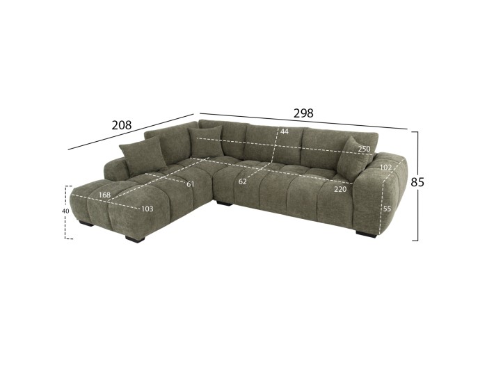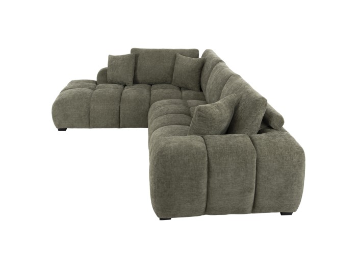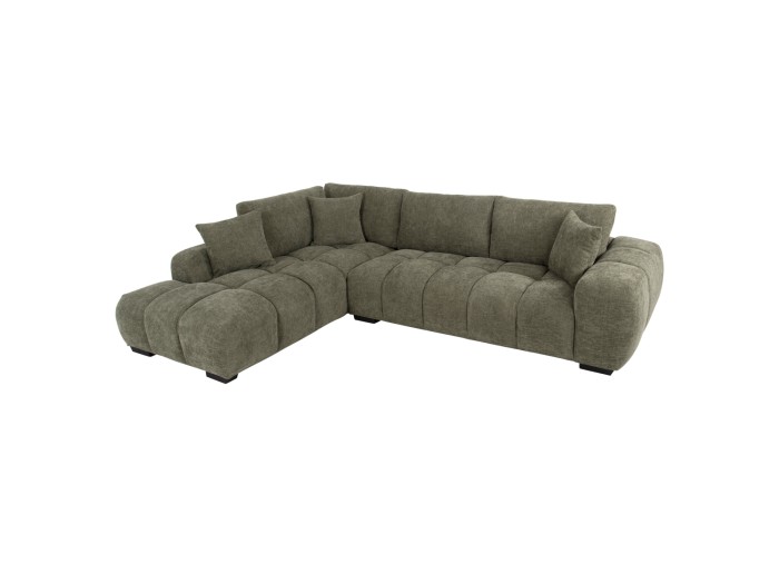 Σας παρουσιάζουμε τον COVEN, έναν υπέροχο μεγάλο καναπέ σε διαμόρφωση ΑΡΙΣΤΕΡΗΣ γωνίας (όπως τον κοιτάς) επενδυμένο με ποιοτικό ύφασμα σε ΠΡΑΣΙΝΟ χρώμα. Ξεκινώντας από το design, ο καναπές φτάνει μέχρι πολύ χαμηλά σε στυλ «ποδιάς» και διαθέτει φαρδιά χαμηλά πόδια-βάσεις σε μαύρο χρώμα. Τα μπράτσα είναι εντυπωσιακά φαρδιά, ενώ η επένδυση είναι σε στυλ καπιτονέ με τις έντονες ραφές! Το κομμάτι που σχηματίζει την γωνία είναι ίδιας αισθητικής και ενώνεται με τον κυρίως καναπέ με κατακόρυφους αναρτήρες πάνελ. Η πλάτη είναι χαμηλή και διαθέτει 4 μαξιλάρια πλάτης με «καραμέλες»(μακρόστενα κυλινδρικά μαξιλάρια) στο πίσω μέρος τους για καλύτερη στήριξη, αλλά και 3 μικρότερα διακοσμητικά μαξιλαράκια. Το κάθισμα διαθέτει γεμίσματα αφρού μεσαίας σκληρότητας σε συνδυασμό με ελατήρια pocket springs, προσφέροντας απαράμιλλη άνεση. Και φυσικά, σας προσφέρουμε αυτόν τον καναπέ με εγγύηση σκελετού 3 ετών!