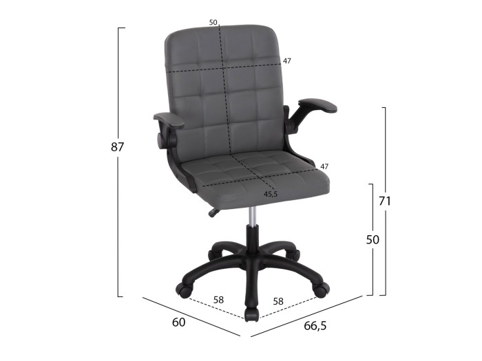 Η καρέκλα γραφείου PORTIMA είναι άλλη μια νέα προσθήκη στην γκάμα μας. Διαθέτει μεσαίου ύψους πλάτη και μπράτσα που ανεβοκατεβαίνουν (flip-up). Η επένδυση της πλάτης και του τετράγωνου καθίσματος έχει γίνει με εξαιρετικής ποιότητας συνθετικό δέρμα PVC με στυλ καπιτονέ σε ΓΚΡΙ χρώμα. Τόσο τα μπράτσα όσο και ο υπόλοιπος σκελετός αλλά και η βάση είναι κατασκευασμένα από υλικό nylon σε ΜΑΥΡΟ χρώμα, όπως και τα ροδάκια. Η ανάρτηση διαθέτει μηχανισμούς ρύθμισης ύψους αλλά και ανάκλισης.