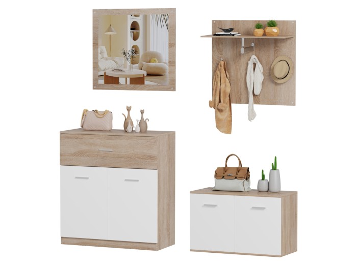 Το σετ εισόδου DIONNE αποτελείται από μια παπουτσοθήκη με συρτάρι, άλλη μία μικρότερη παπουτσοθήκη ίδιας αισθητικής, μια κρεμάστρα με 3 θέσεις κρέμασης και ραφάκι, κι έναν καθρέπτη τοίχου. Όλα τα κομμάτια του σετ είναι κατασκευασμένα από μελαμίνη σε αποχρώσεις ΣΟΝΑΜΑ και ΛΕΥΚΟ.