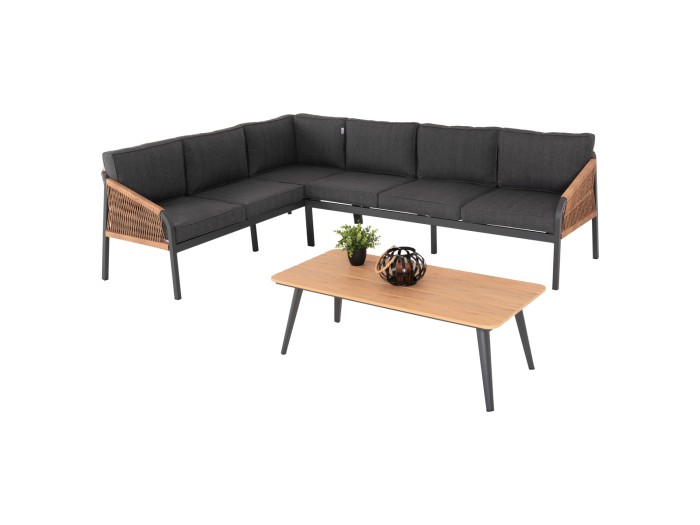 Σας παρουσιάζουμε το εντυπωσιακό και νέο γωνιακό σαλόνι εξωτερικού χώρου MAERLY σε ΑΝΘΡΑΚΙ χρώμα, με τραπεζάκι, και 2 καναπέδες. Ένα σετ που θα το λατρέψετε με την πρώτη ματιά. Ο σκελετός στους καναπέδες είναι από αλουμίνιο με ΜΠΕΖ συνθετικό σχοινί στα μπράτσα. Το τραπεζάκι έχει επιφάνεια από polywood σε χρώμα ΦΥΣΙΚΟΥ ξύλου. Τα μαξιλάρια σε όλο το σετ είναι επενδυμένα με πολυεστερικό ύφασμα σε ΑΝΘΡΑΚΙ χρώμα και διαθέτουν γέμισμα με μέτριας σκληρότητας αφρώδη υλικά για την μεγαλύτερη δυνατή άνεση, αλλά και φερμουάρ. Τι άλλο να ζητήσει κανείς για να αναβαθμίσει τον εξωτερικό χώρο του;