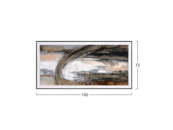 Ανάμεσα σε όλα τα διακοσμητικά στοιχεία, τα έργα τέχνης και ειδικά οι πίνακες ζωγραφικής παίζουν εξέχοντα ρόλο: όχι μόνο προσθέτουν χρώμα και αισθητική ομορφιά, αλλά δίνουν επίσης βάθος και νόημα στον χώρο μας. Ένας πίνακας μεταμορφώνει τον τρόπο που αντιλαμβανόμαστε έναν χώρο. Διακοσμήστε, λοιπόν, τον χώρο σας με έναν από τους καινούργιους πίνακες που προστέθηκαν στην γκάμα μας! Αυτός ο ορθογώνιος πίνακας απεικονίζει αφηρημένα χρώματα και είναι ζωγραφισμένος 100% με το χέρι σε καμβά. Η κορνίζα είναι σε ΜΑΥΡΟ χρώμα από πολυστυρένιο.