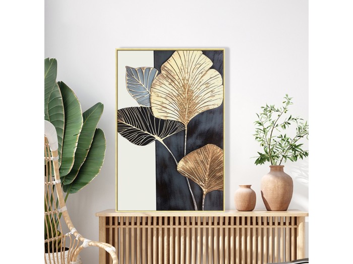 Ανάμεσα σε όλα τα διακοσμητικά στοιχεία, τα έργα τέχνης και ειδικά οι πίνακες ζωγραφικής παίζουν εξέχοντα ρόλο: όχι μόνο προσθέτουν χρώμα και αισθητική ομορφιά, αλλά δίνουν επίσης βάθος και νόημα στον χώρο μας. Ένας πίνακας μεταμορφώνει τον τρόπο που αντιλαμβανόμαστε έναν χώρο. Διακοσμήστε, λοιπόν, τον χώρο σας με έναν από τους καινούργιους πίνακες που προστέθηκαν στην γκάμα μας! Αυτός ο πίνακας απεικονίζει πλατιά φύλλα και είναι ζωγραφισμένος κατά 40% με το χέρι σε καμβά με εκτύπωση. Η κορνίζα είναι μπεζ από πολυστυρένιο.