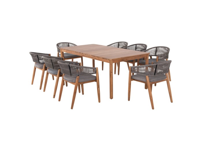 Αυτό το σετ τραπεζαρίας εξωτερικού χώρου 9τμχ αποτελείται από το όμορφο χειροποίητο τραπέζι NAVANT κατασκευασμένο εξολοκλήρου από φυσικό μασίφ ξύλο ΑΚΑΚΙΑΣ σε ΦΥΣΙΚΟ χρώμα, και από 8 καρέκλες τραπεζαρίας NAVAN κατασκευασμένες επίσης από ξύλο ακακίας και σχοινί nylon σε ΓΚΡΙ χρώμα.