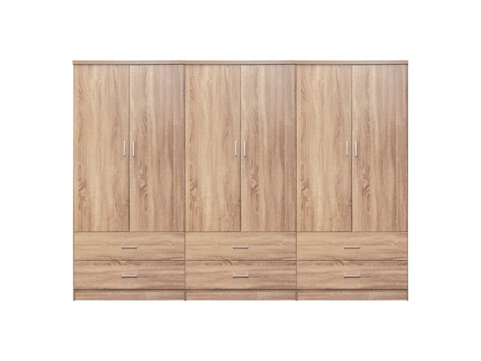 Γνωρίστε την 6-φυλλη ντουλάπα-γκαρνταρόμπα REINA. Πρόκειται για μια μεγάλη ντουλάπα με 6 πόρτες, και στο εσωτερικό της υπάρχει μόνο μια INOX μπάρα για κρέμαση ρούχων. Κάτω ακριβώς από τον χώρο της γκαρνταρόμπας υπάρχουν και 6 ευρύχωρα συρτάρια. Οι πόρτες αλλά και τα συρτάρια ανοίγουν με καλαίσθητα ασημί χερούλια. Είναι κατασκευασμένη από μελαμίνη σε ΣΟΝΑΜΑ χρώμα και αισθητικά μπορεί να ταιριάξει με πολλά άλλα στυλ, χάρη και στις «καθαρές» γραμμές της.
