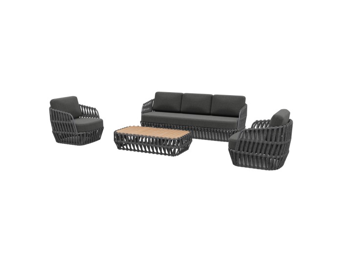 Σας παρουσιάζουμε το εντυπωσιακό σετ εξωτερικού χώρου 4τμχ SABO σε ΣΚΟΥΡΟ ΓΚΡΙ χρώμα, με τραπεζάκι, 2 πολυθρόνες και 1 τριθέσιο καναπέ. Ένα σετ που ξεχωρίζει με την πρώτη ματιά. Ο σκελετός σε όλο το σετ είναι από αλουμίνιο επενδυμένο με ΣΚΟΥΡΟ ΓΚΡΙ P.E. σχοινί. Το όμορφο τραπέζι έχει επιφάνεια από ποιοτικό ξύλο teak. Το design τους είναι πανέμορφο στην όψη ενώ η στιβαρότητά τους είναι κάτι παραπάνω από εμφανής. Τα μαξιλάρια σε όλο το σετ είναι επενδυμένα με ποιοτικό ύφασμα OLEFIN σε ΣΚΟΥΡΟ ΓΚΡΙ χρώμα και διαθέτουν γέμισμα με μέτριας σκληρότητας αφρώδη υλικά για την μεγαλύτερη δυνατή άνεση. Τι άλλο να ζητήσει κανείς για να αναβαθμίσει τον εξωτερικό χώρο του;