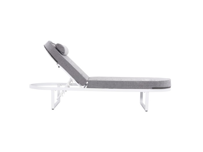 Η επαγγελματική ξαπλώστρα παραλίας MALLOW σε ΛΕΥΚΟ χρώμα είναι στιβαρή και πολυτελής. Είναι κατασκευασμένη από αλουμίνιο και γαλβανιζέ μέταλλο στο εσωτερικό του σκελετού για έξτρα ανθεκτικότητα, και διαθέτει ψηλό μαξιλάρι(στρώμα) με προσκέφαλο σε ΓΚΡΙ χρώμα. Σχεδιαστικά οι «γραμμές» της είναι ξεκάθαρες σε ΟΒΑΛ υλοποίηση. Η σκαλιέρα έχει 5 επίπεδα (μαζί με την flat).