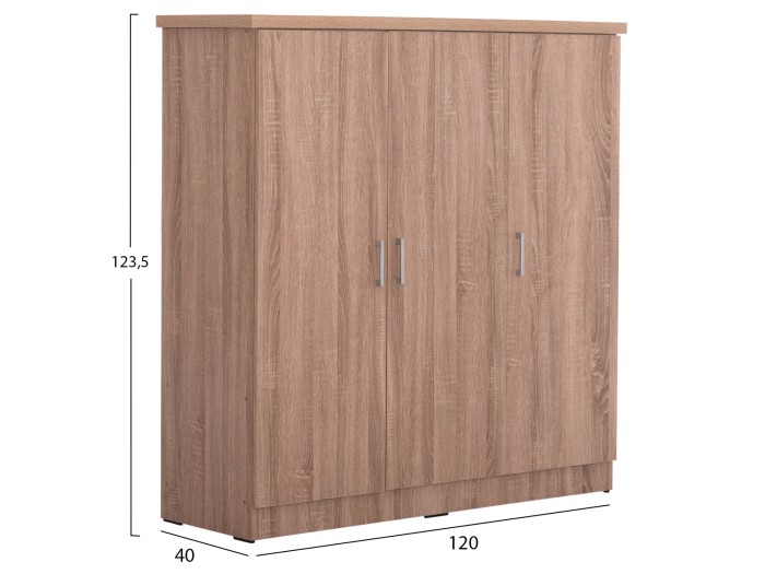 Η τρίφυλλη ντουλάπα FUENTO είναι μια πρακτικότατη, σχετικά κοντή (άρα ιδανική και για παιδικά δωμάτια), ντουλάπα που έχει φτιαχτεί με γνώμονα την όσο το δυνατόν καλύτερη εκμετάλλευση του χώρου. Έχει 3 πόρτες, αλλά με απροσδόκητα άνετους χώρους στο εσωτερικό της. Η πλευρά με την διπλή πόρτα διαθέτει ράφια και μια μεταλλική μπάρα για κρέμαση. Η πλευρά με την μονή πόρτα διαθέτει μόνο ράφια. Είναι κατασκευασμένη από μελαμίνη σε SONAMA OAK χρώμα και αισθητικά μπορεί να ταιριάξει με πολλά άλλα στυλ, χάρη και στις «καθαρές» γραμμές της.