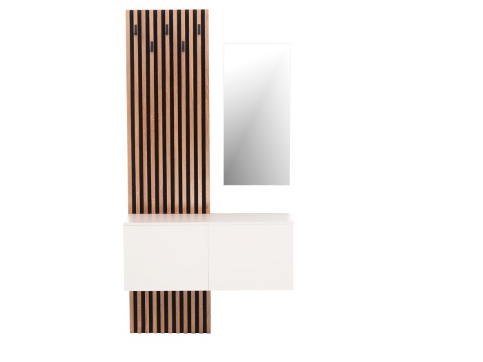 Το έπιπλο εισόδου MYLES αποτελείται από μια μακρόστενη ψηλή «πλάτη» με 5 μονές κρεμάστρες στην μία πλευρά, ενώ στην άλλη υπάρχει ένα επιτοίχιο ντουλάπι με ένα ράφι στο εσωτερικό που κλείνει με πόρτα/καθρέπτη. Η σύνθεση αυτή ολοκληρώνεται με μια επίσης επιτοίχια (κρεμαστή)παπουτσοθήκη-ντουλάπι με δύο πόρτες, χωρισμένη σε 4 χώρους. Ένα σετ μελαμίνης σε χρώμα SONAMA-ΛΕΥΚΟ που θα σας ενθουσιάσει με την πρακτικότητα αλλά και το στυλ του.