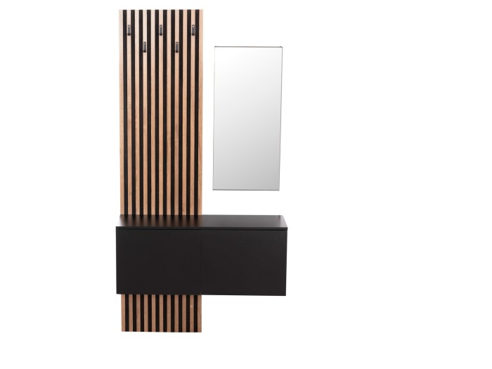 Το έπιπλο εισόδου MYLES αποτελείται από μια μακρόστενη ψηλή «πλάτη» με 5 μονές κρεμάστρες στην μία πλευρά, ενώ στην άλλη υπάρχει ένα επιτοίχιο ντουλάπι με ένα ράφι στο εσωτερικό που κλείνει με πόρτα/καθρέπτη. Η σύνθεση αυτή ολοκληρώνεται με μια επίσης επιτοίχια (κρεμαστή)παπουτσοθήκη-ντουλάπι με δύο πόρτες, χωρισμένη σε 4 χώρους. Ένα σετ μελαμίνης σε χρώμα SONAMA-ΜΑΥΡΟ που θα σας ενθουσιάσει με την πρακτικότητα αλλά και το στυλ του.