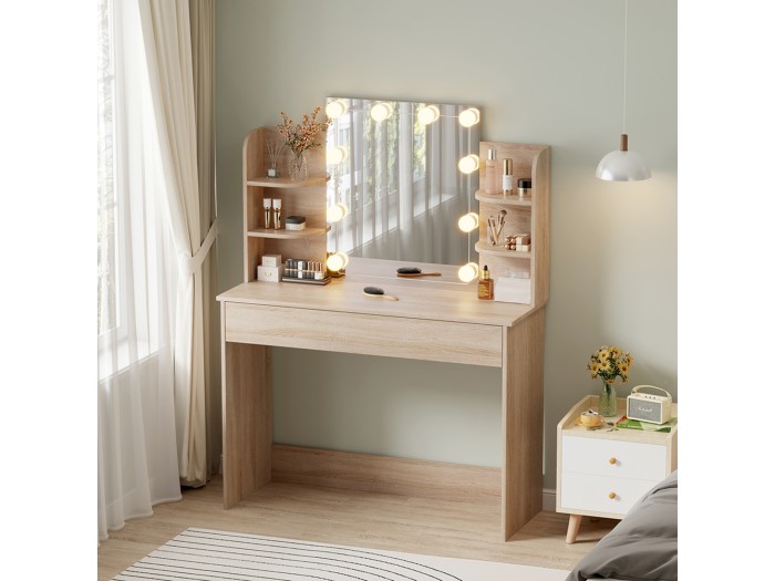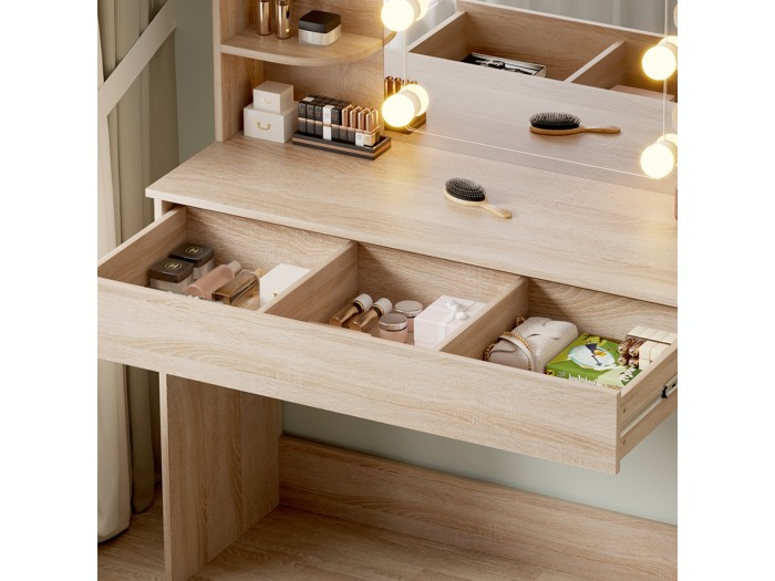 Η νέα τουαλέτα LAURYN είναι ένα πρακτικότατο έπιπλο σε SONAMA χρώμα που θα αλλάξει την εικόνα του χώρου σας. Αποτελείται από ένα τραπέζι με καθρέπτη και 2 συρτάρια κάτω από την επιφάνεια. Αυτό όμως που κερδίζει τις εντυπώσεις είναι ότι ο καθρέπτης είναι τοποθετημένος στο κέντρο και συνοδεύεται από φώτα LED περιμετρικά, καθώς και από ράφια τοποθέτησης αντικειμένων δεξιά κι αριστερά, απογειώνοντας την χρησιμότητα του επίπλου.