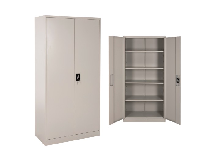 Η ΗΜ5959.01 είναι μια πρακτικότατη μεταλλική ντουλάπα που έχει φτιαχτεί με γνώμονα την χωρητικότητα και την ανθεκτικότητα. Είναι δίφυλλη με τις δύο πόρτες να κλείνουν ακριβώς στην μέση της κατασκευής, ενώ το εσωτερικό είναι ένας ενιαίος χώρος χωρίς κάθετα χωρίσματα με 4 ράφια που δημιουργούν 5 αποθηκευτικούς χώρους. Οι πόρτες διαθέτουν κλειδαριά που κλειδώνει με κλειδί, ενώ το χρώμα της ντουλάπας είναι πολύ ανοιχτό γκρι.