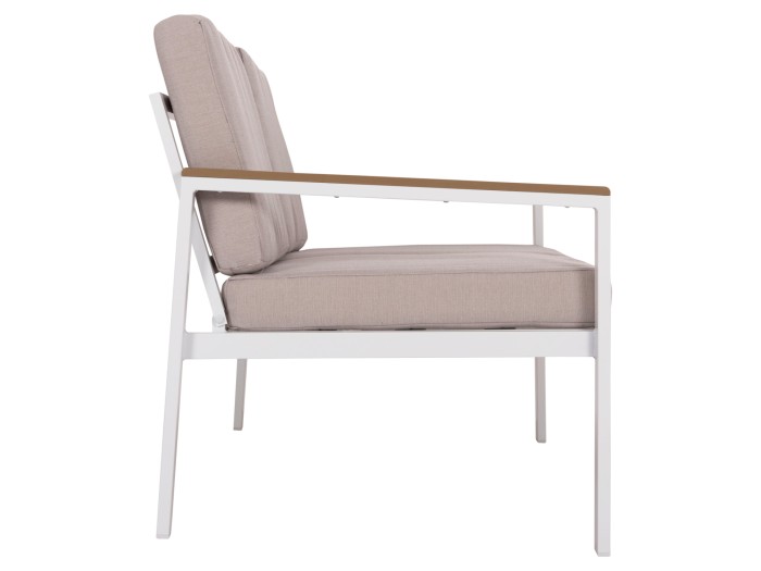 Ο SAFIΝ είναι ένας όμορφος 2θέσιος καναπές εξωτερικού χώρου σε απαλό συνδυασμό ΛΕΥΚΟΥ-ΜΠΕΖ. Ο συνδυασμός του σκελετού αλουμινίου σε ΛΕΥΚΟ χρώμα με τα μεγάλα μαξιλάρια πλάτης και καθίσματος με OLEFIN ύφασμα σε ΜΠΕΖ χρώμα είναι μοναδικός, και μπορεί να αλλάξει άμεσα την εικόνα οποιουδήποτε εξωτερικού χώρου. Χαρακτηριστικό γνώρισμα αυτού του καναπέ είναι ότι τα πόδια είναι ψηλά, με αποτέλεσμα και το ύψος του καθίσματος να είναι ψηλό, ενώ η «πινελιά» με το polywood στα μπράτσα δίνει έναν τόνο πολυτέλειας που δεν περνάει απαρατήρητη.