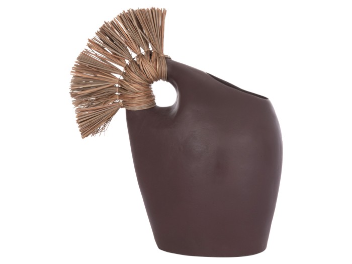Το επιτραπέζιο χειροποίητο διακοσμητικό βάζο ALICA2 είναι ένα πολύ ιδιαίτερο διακοσμητικό στοιχείο για κάθε χώρο. Είναι κατασκευασμένο εξολοκλήρου από τερακότα σε ΣΟΚΟΛΑΤΙ χρώμα, ενώ διαθέτει και ένα χερούλι επενδυμένο με αποξηραμένο grass, και ένα φαρδύ στόμιο.