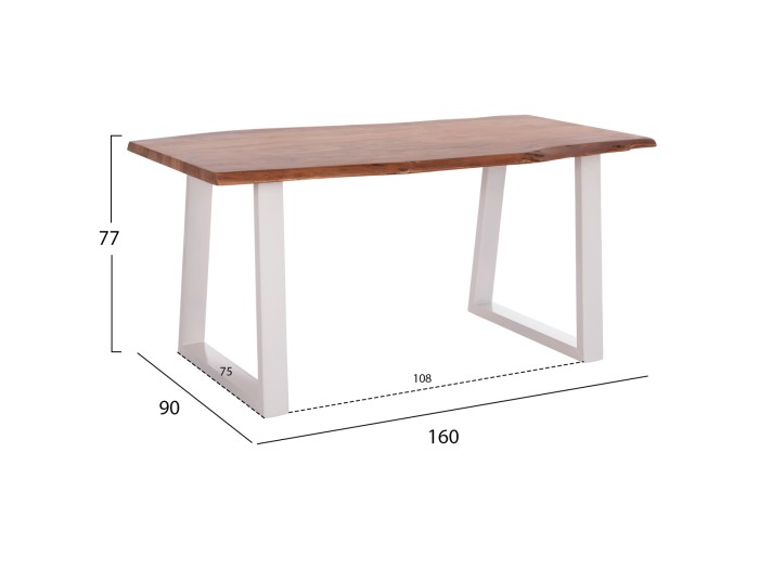 Το μοναδικό χειροποίητο τραπέζι MONTANA διαθέτει επιφάνεια από φυσικό μασίφ ξύλο ΑΚΑΚΙΑΣ σε ΦΥΣΙΚΟ χρώμα. To σχήμα είναι ορθογώνιο και στηρίζεται σε δύο ΛΕΥΚΕΣ μεταλλικές βάσεις με τραπεζοειδές σχήμα. Το μοντέρνο design συναντά την φύση και δίνει μια διαχρονική και ζεστή αίσθηση στον χώρο σας.