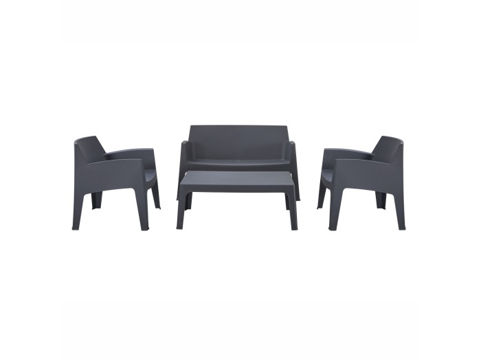 Ένα ορθογώνιο τραπεζάκι, 2 στοιβαζόμενες πολυθρόνες κι έναν 2-θέσιο καναπέ, τα οποία είναι εξολοκλήρου κατασκευασμένα από πολυπροπυλένιο σε ΓΚΡΙ χρώμα. Σχεδιαστικά, είναι λιτό και μπορεί να χρησιμοποιηθεί με πολλούς τρόπους προσφέροντας πρακτική και ανθεκτική χρήση. Ιδανική πρόταση για χρήση σε εξωτερικούς χώρους, είτε επαγγελματικούς (χώροι δεξιώσεων, εταιρείες catering, κλπ.) είτε για το σπίτι.