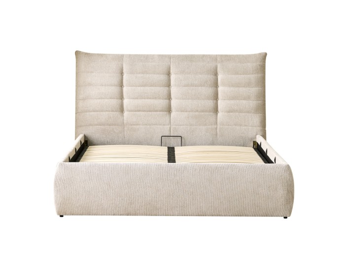 Το στρώμα στηρίζεται σε 20 σειρές εργονομικές τάβλες στήριξης, οι οποίες τοποθετούνται σε ένα μεταλλικό πλαίσιο που ανασηκώνεται με μηχανισμό ασφαλείας, προσφέροντας έναν μεγάλο αποθηκευτικό χώρο επενδυμένο επίσης με ύφασμα. Μια μοντέρνα πρόταση που θα ανανεώσει το υπνοδωμάτιό σας.