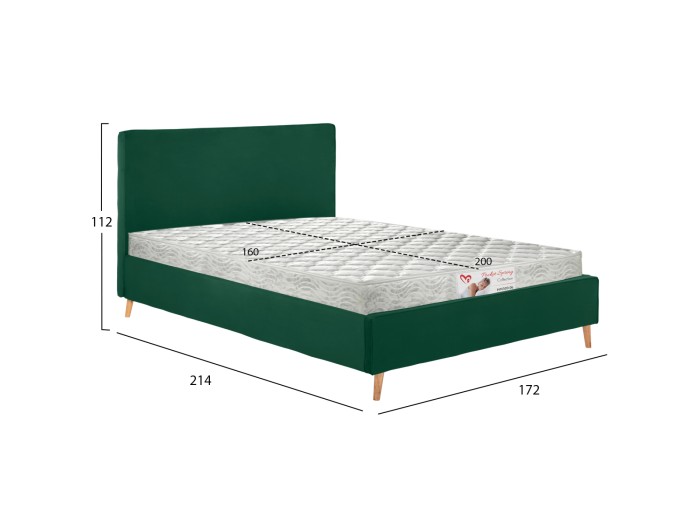 Το υπέρδιπλο κρεβάτι INDRA είναι επενδυμένο με βελούδο σε χρώμα ΚΥΠΑΡΙΣΣΙ με ίδιο ρέλι στις ραφές. Το στρώμα που συνοδεύει το κρεβάτι τοποθετείται σε δύο σειρές ανατομικές τάβλες, είναι διπλής όψης και έχει τεχνολογία με pocket springs (ανεξάρτητα ελατήρια). Τα πόδια είναι ξύλινα σε φυσικό χρώμα.